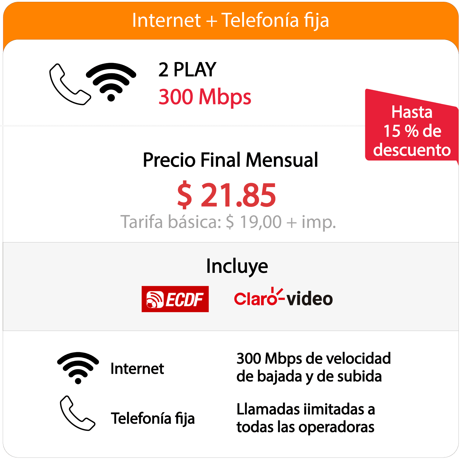 El precio del plan es de $19 más impuestos, con un total final aproximado de $21.85 mensuales. Este valor incluye todos los servicios: internet de 300 Mbps, línea fija ilimitada y acceso a Claro Video y ECDF Canal del Futbol.