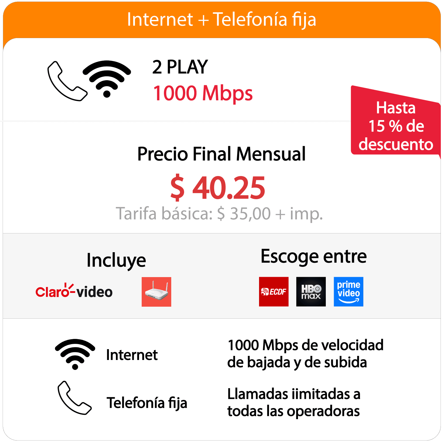 Además del internet de alta velocidad, el plan incluye acceso a plataformas de entretenimiento como Claro Video, una línea fija con llamadas ilimitadas y un punto WiFi para mejorar la cobertura dentro del hogar o negocio.
