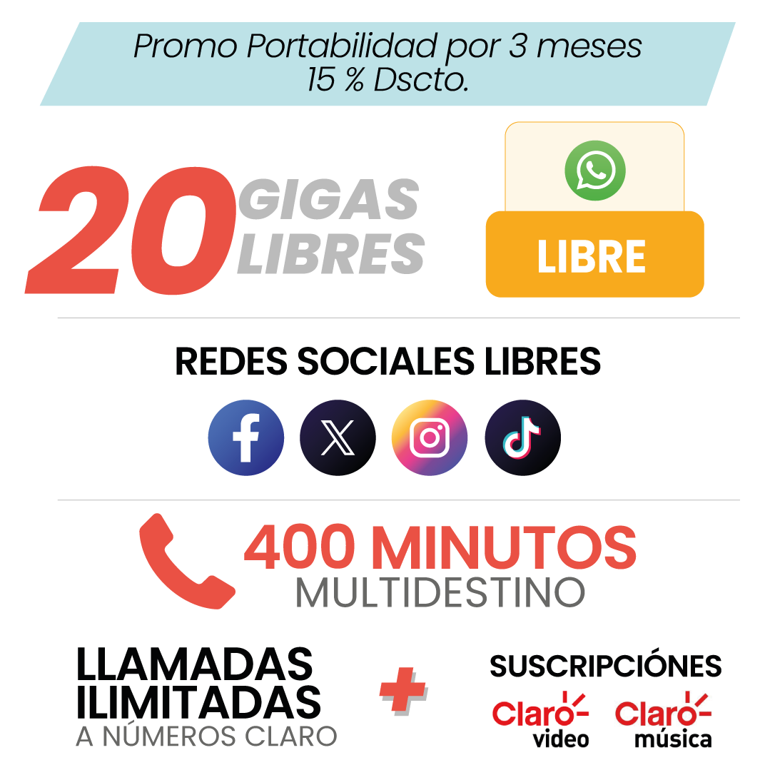 El Plan incluye 20 GB de datos para navegación, GB libres para WhatsApp, Facebook, Instagram, Tik Tok y X, 400 minutos a todo destino nacional, llamadas ilimitadas a Claro, 200 SMS, suscripción gratuita a Claro Video por 24 meses con 10 GB adicionales para ver contenido y Claro Música
